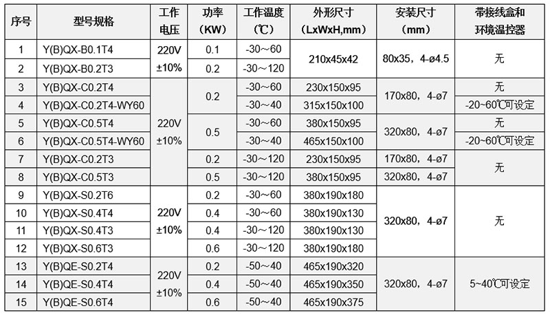 注:1)工作电压:常规220V,12~380V可定制。2)YQX为非防爆型,YBQX为防爆型(取证中)。
